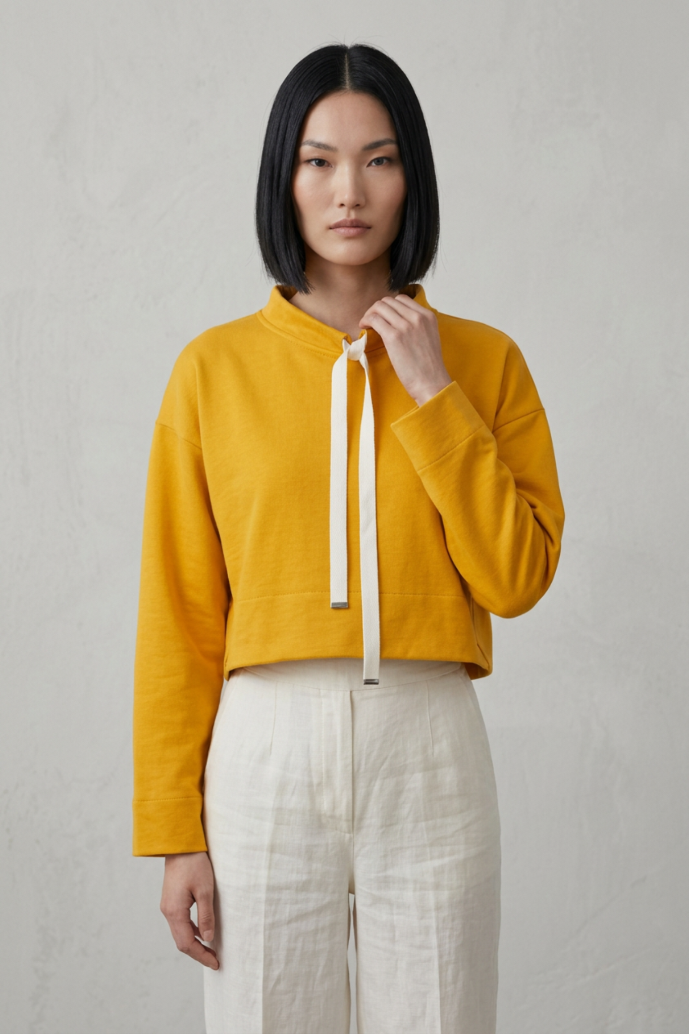 Discover absolute comfort and a refined minimalist style with the GESSICA ALBU top. Specially created for the modern woman who values the quality of materials and the impact on the environment, this mustard yellow top is the versatile piece that should not be missing from your wardrobe.